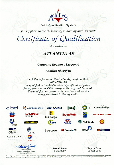 Atlantia as er kvalifisert leverandør til oljeindustrien gjennom Achilles Felles Kvalifikasjonsordning.